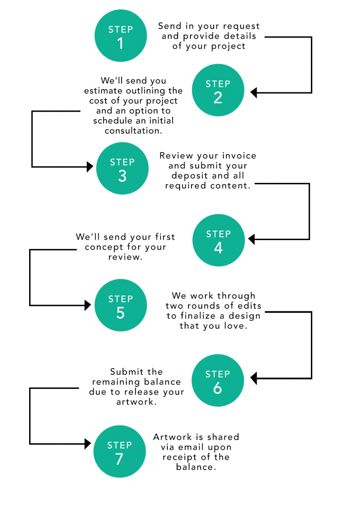 A 50% non-refundable deposit is due to begin designs and final payment is due before the release of printed or digital designs. Payment for Rush Orders are due in full, up front with all content.